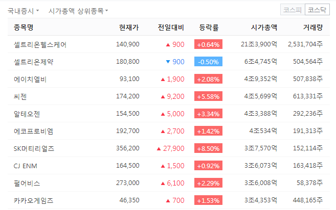 시총으로는 압도적인 격차로 삼성전자가 1위입니다. 2위 하이닉스와 5배 정도 차이가 나네요. 셀트리온이나 카카오 같은 기업은 코스닥에서 이전해오기도 했죠.