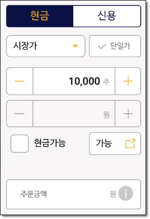 아래와 같이 시장가로 10,000주를 주문했다고 가정해보죠. 시장가 주문으로 선택하면 가격 창은 입력할 수 없도록 비활성화 상태로 변경됩니다. 단지 주식 수만 입력하게 되어있습니다.