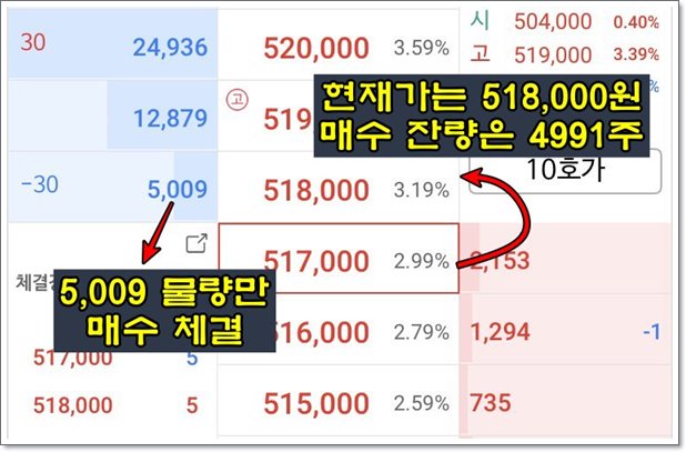 물론 미체결된 4,991주는 새로운 매도 물량이 나타난다면 주문 가격인 518,000원에 체결됩니다.