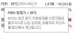 이 값을 기준으로 2021년 현재의 PBR을 계산해보면 다음과 같습니다.