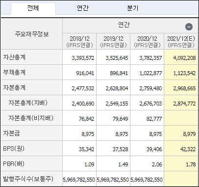 - BPS : 순자산 / 총주식수 = 2,874,772억원 / 6,792,669,250 = 42,322