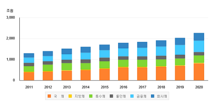 2020년 기준으로 2263조라는 어마어마한 금액을 자랑하고 있습니다. 10년간의 자료를 살펴보면 다음과 같이 꾸준하게 증가하고 있는 것을 알 수 있죠.