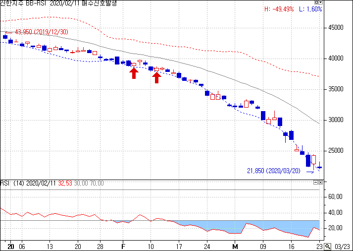 | 주가가 급격하게 많이 빠졌을 때 추세 전환이 기대되면 매수 | 최근 5개 봉의 종가가 밴드 하단 아래로 간 적이 있고 RSI가 30을 상향돌파하면 매수를 하자 |