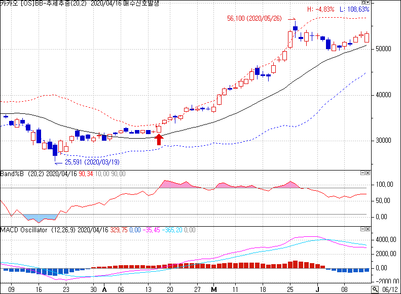 두 번째 매매기법은 상·하단 밴드와 추가 보조지표를 활용하는 추세추종 기법입니다. 주가가 밴드 상한선에 접근하고 다른 보조지표가 강세를 확증할 때에는 매수, 주가가 하한선에 접근하고 지표가 약세를 확증할 때에는 매도하는 방법입니다.