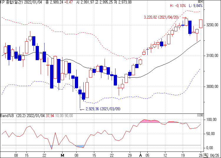 Band %b = (주가 - 볼린저밴드 하단) / (볼린저밴드 상단 - 볼린저밴드 하단) × 100