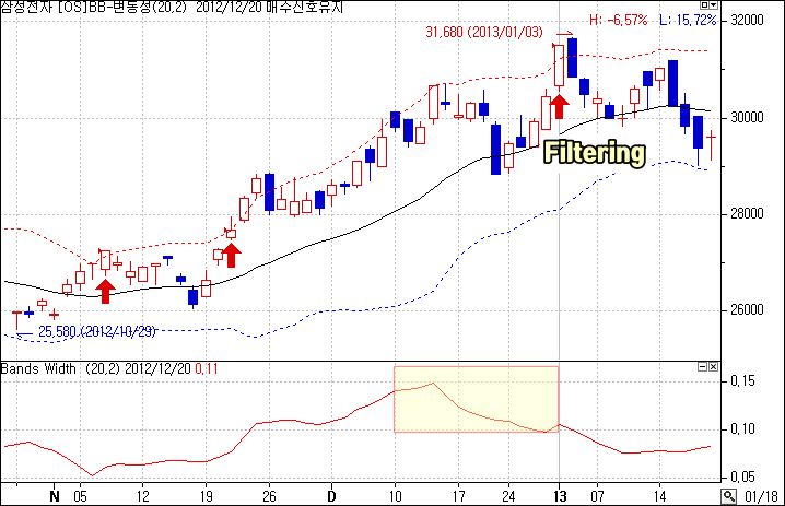 - 가격의 등락폭이 커지면 밴드의 상-하한선 폭이 확대된다. 이때 본격적인 추세가 발생할 가능성이 높다.