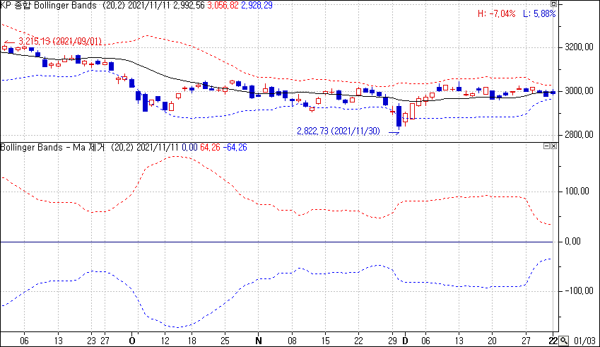 만약 20일선의 영향을 제거하고 살펴보면 0을 기준으로 위·아래 밴드가 동일하게 확장, 축소되는 것을 알 수 있습니다.