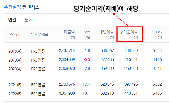 그렇다면 EPS의 순이익은 어떤 수치를 이용할까요? 바로 당기순이익이 아닌 지배주주 당기순이익을 기준으로 계산하게 됩니다.