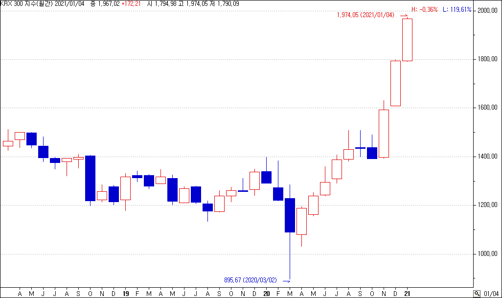 아래 그림은 KRX300 지수의 월봉 차트입니다.