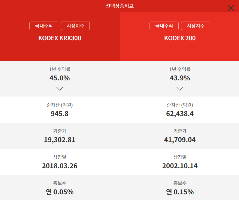 KRX300 지수는 만든 지 얼마 지나지 않아서 크게 활성화되지는 않은 것 같습니다. 관련 ETF를 비교해 보면 KODEX 200과 자산 규모가 꽤 차이나는 편이네요.