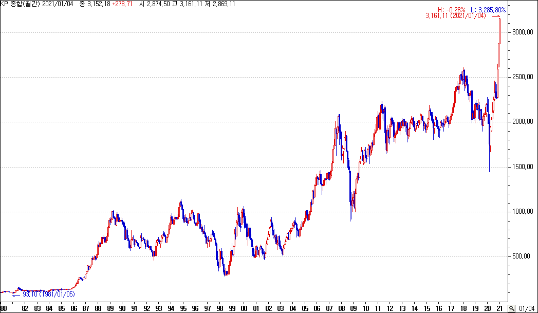 2021년 1월 8일의 KOSPI 지수는 3152.18 포인트입니다. 이 의미는 코스피시장의 시가총액이 1980년 1월 4일보다 31.5배 (3150%) 상승했다는 것이죠.